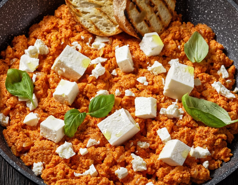 Strapatsada is a Greek version of scrambled eggs. It is prepared with the same technique, but with tomatoes and, if desired, sprinkled with crumbly brine cheese - feta, bryndza, goat cheese, and others.
